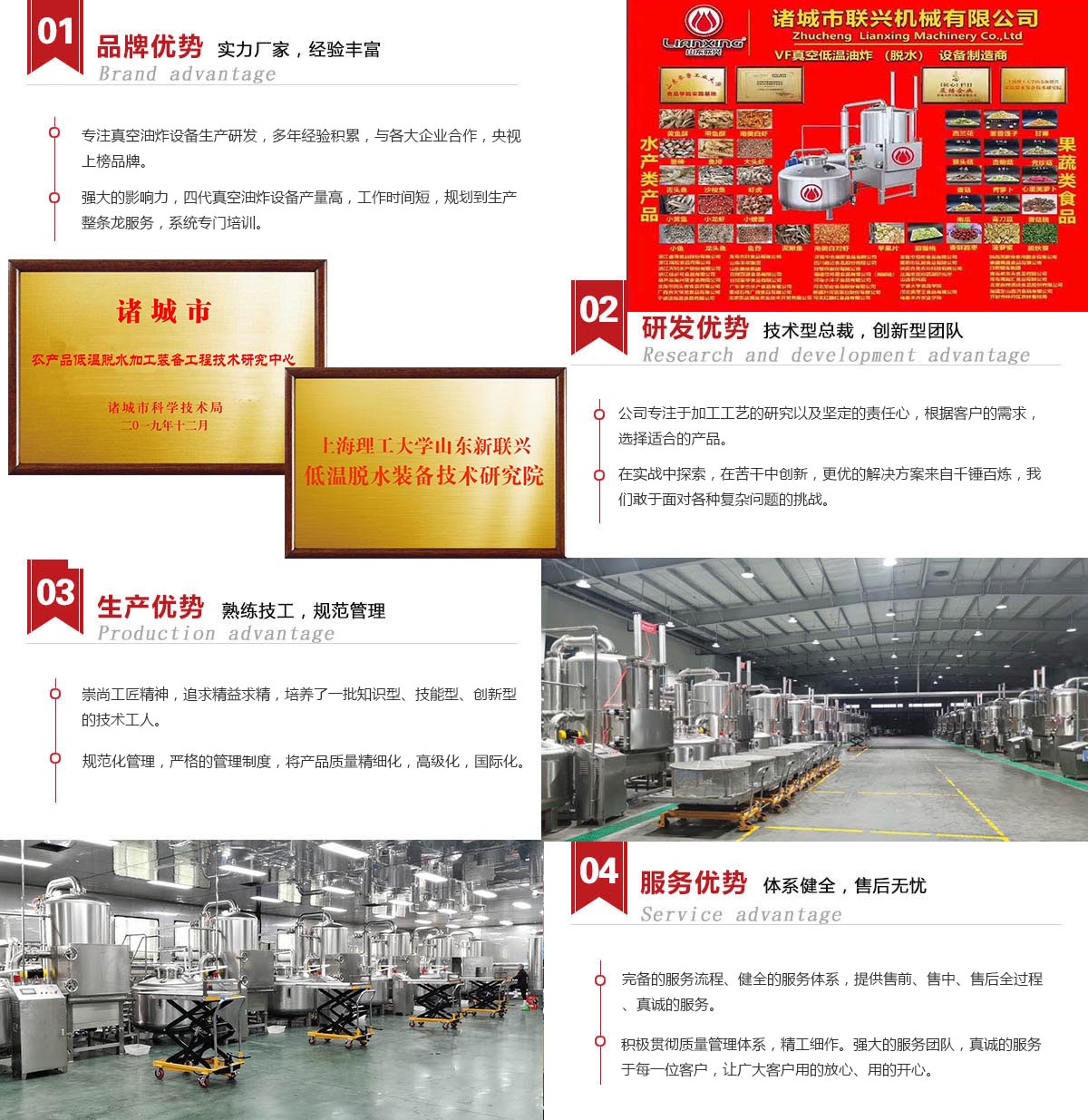 聯(lián)興第四代真空低溫油炸機(jī)顛覆了傳統(tǒng)意義上的真空油炸機(jī)工作時(shí)間長、工作效率低的概念。我公司通過大量客戶使用反饋,將設(shè)備進(jìn)行改造升級(jí),同等型號(hào)同等設(shè)備較傳統(tǒng)意義上的真空油炸機(jī)工作效率提高了30%,且我公司每臺(tái)設(shè)備零部件均有存檔,方便為客戶提供便捷迅速的售后服務(wù)。